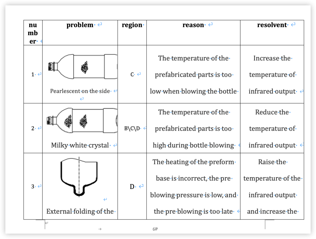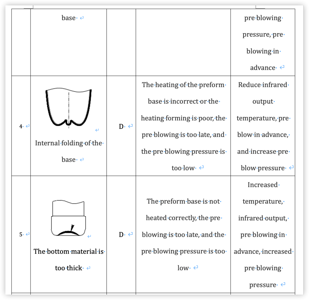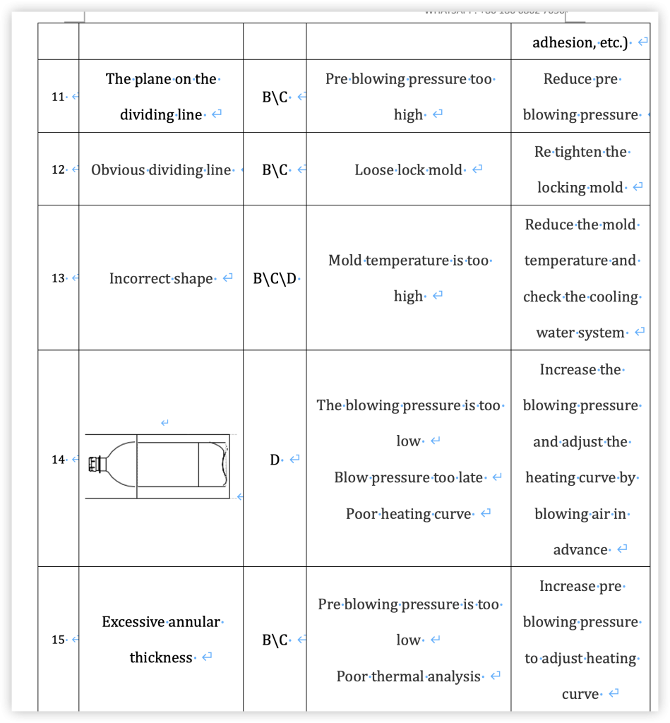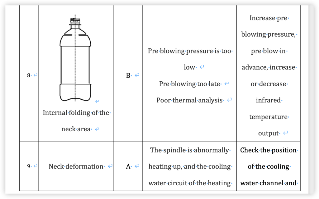 Para minimizar a perda de material, a solução deve ser solucionar o mau funcionamento da máquina em até uma hora. Dessa forma, a perda de material, o baixo desempenho da máquina e os danos anormais aos componentes podem ser reduzidos. A manutenção diária é realizada quase que diariamente durante a operação, incluindo a verificação de todas as pressões de pré-sopro ajustáveis, pressão de sopro, etc.